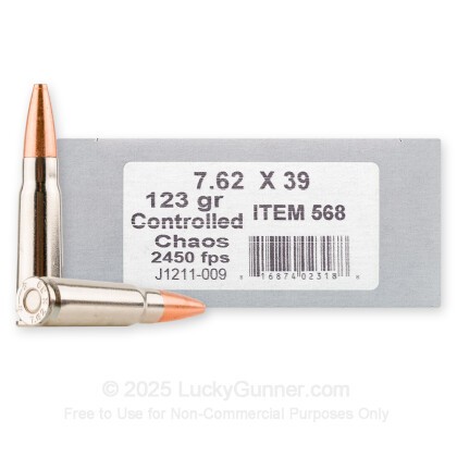 This cartridge’s 123 grain Controlled Chaos projectile is a solid copper hollow point. It is designed to wreak maximum damage inside game, as well as minimize the risk of pass through. The lead-free Controlled Chaos penetrates flesh to a predetermined depth, at which instant it explosively fragments apart. The burst of copper shrapnel excavates a large temporary wound cavity, and also extends multiple smaller wound channels in multiple directions. Underwood claims the energy spike massively disrupts the quarry’s circulatory and nervous systems, which is another way of saying “hunt: successful.”