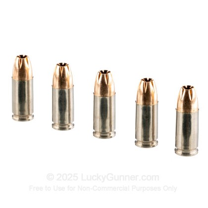 This 9mm cartridge comes from Federal’s Hydra-Shok line of ammunition, a trusted brand for self-defense since its introduction in 1989. The Hydra-Shok Deep projectile improves on the brand’s core as well as its classic center post design, making the latter robuster so that it more effectively prevents fabric clogging upon impact to permit the bullet to expand completely. This hollow point bullet penetrates 15 inches into bare ballistic gel, the ideal depth to achieve according to current FBI standards for personal protection. This bullet’s durable jacket further assists with penetration, and sports deep notches to help control expansion.