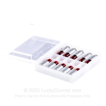 This round features an aluminum shell casing, which is inexpensive, lightweight, and Berdan primed as a reminder that you should not reload it. Note that a 9mm round with so light a projectile may require manual cycling of a semi-auto. Also note that shot cartridges are incompatible with weapons that have ported barrels or compensators.