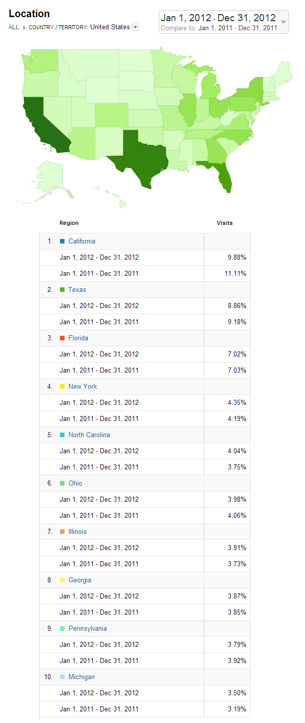 Many of you may be surprised that we receive more traffic from California than any other state in the Union  (even after a slight decline last year) – I know I would have guessed Texas, right?  Can anyone guess who #11 is (feel free to answer in the comments)?