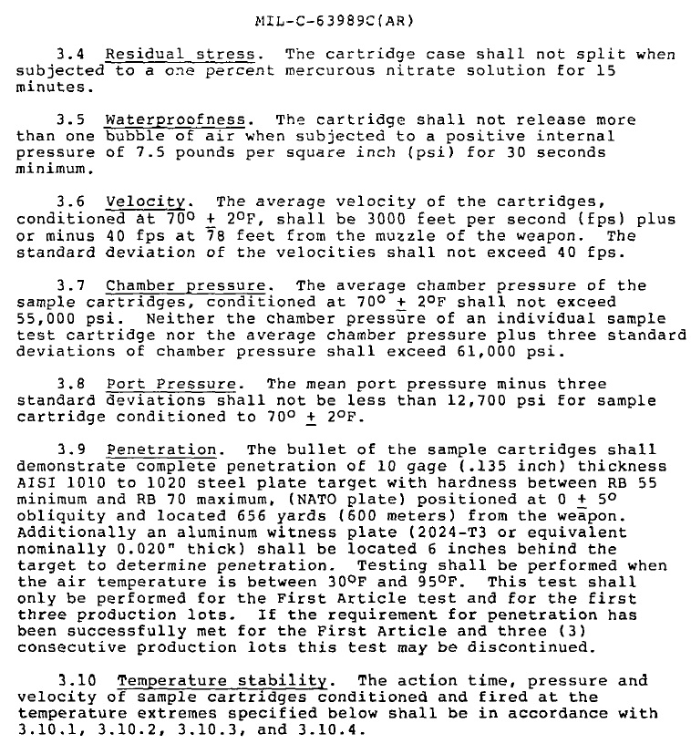 Despite this lack of SAAMI standardization, most of the 5.56 ammunition on the market is manufactured by companies that produce 5.56 for various militaries; the 5.56 they sell to civilians is essentially identical, and thus follows the requirements and maximum pressures set forth by those military clients. As you can see from this short excerpt from a 27-page specification for US Military ammunition, military requirements are very exacting.