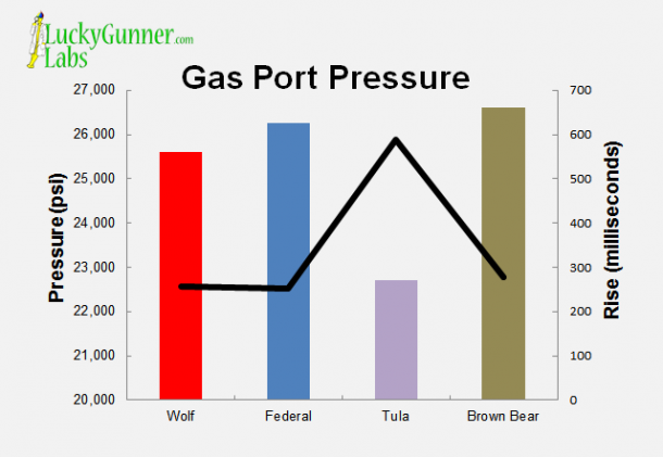 What’s really important in this case, however, is not the maximum chamber pressure number, but powder burn rate and thus gas port pressure. Whether measured in clean, fouled, new, or worn out barrels, Tula exhibited gas port pressures that were 10-20% lower than all other ammunition types.