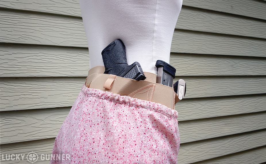 It’s a rare skirt that has belt loops suitable for a belt-mounted holster, but I’ve seen it done. If a belt is not an option, the single best way to carry a gun in a skirt is with a belly band. Belly bands are usually made of a type of elastic material that wraps around the midsection with one or several pockets made for carrying a firearm or other gear. They are adjustable and comfortably worn in dress slacks or yoga pants that may not have belt loops or be too flimsy to hold up the weight of a gun.