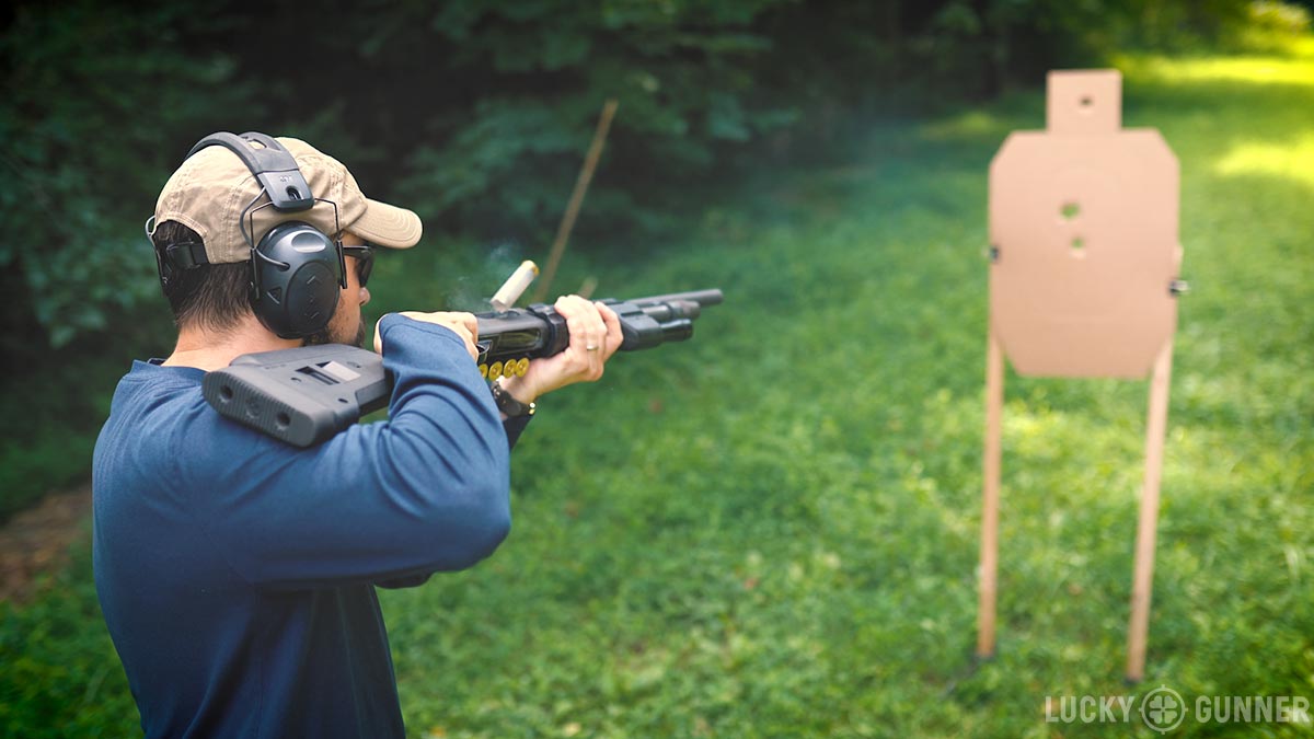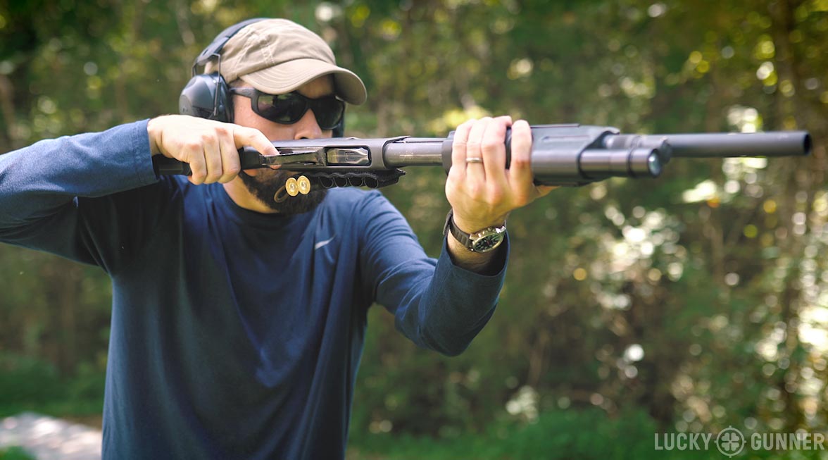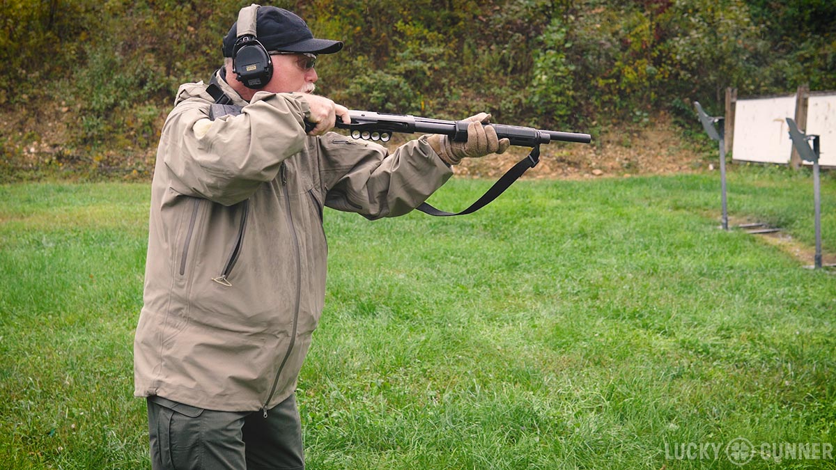 If I need to fire from the short stocking position, I just bring the muzzle up. Then, get a good push-pull going. That’s another critical Rob Haught technique for any kind of shotgun shooting. Push forward on the forend and pull back with the firing hand, and then fire. So even though I don’t have the mass of my upper body behind the stock to help control the gun the way I normally would, with a good push-pull, I’m still able to manage that recoil and I can get it back on target for a follow-up shot if necessary.
