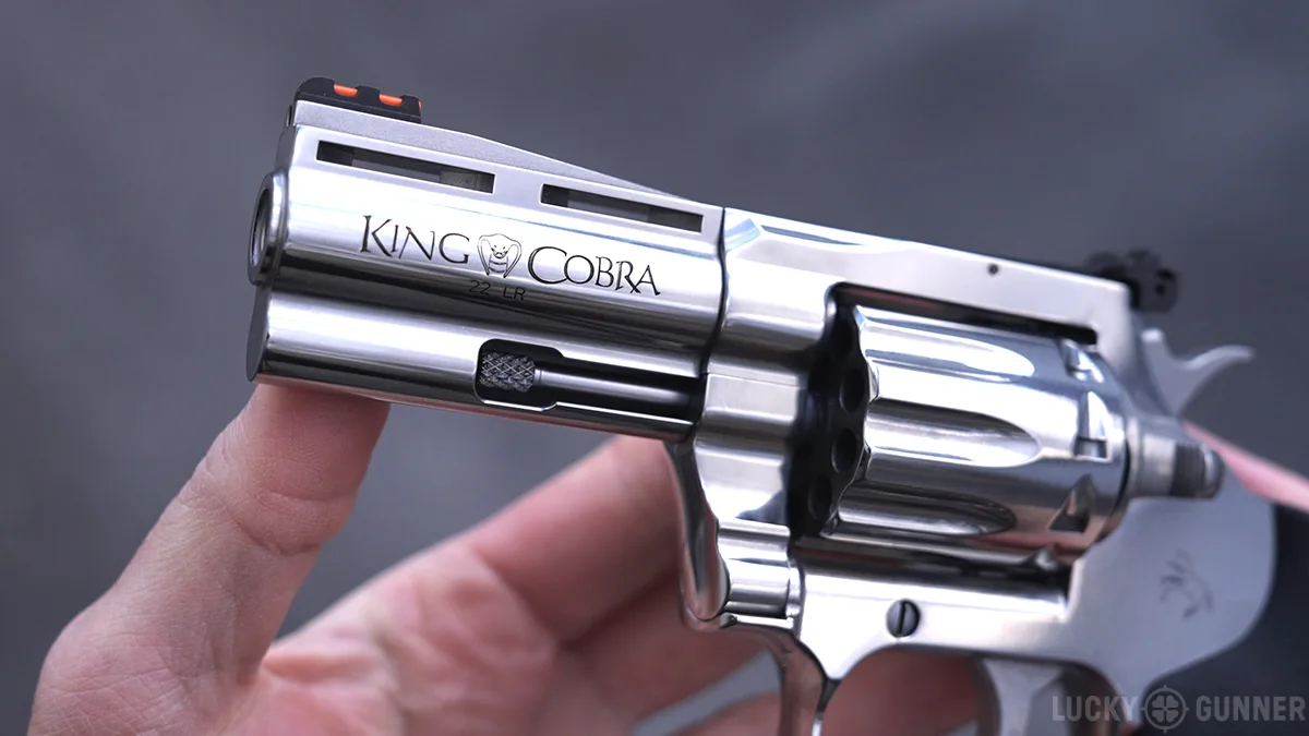 The .22 LR version of the Colt King Cobra came out in 2022. This is their one and only rimfire model, but they do offer it in five different barrel lengths. This one is the 3-inch model because, as we’ve already established in our last video, 3-inch revolvers are objectively the best. But if you’re one of the poor unenlightened souls who objected to that comment, you can also have it with a 2-inch, 4.25-inch, 6-inch, or even 8-inch barrel. That’s more barrel length options than any other .22 revolver on the market.
