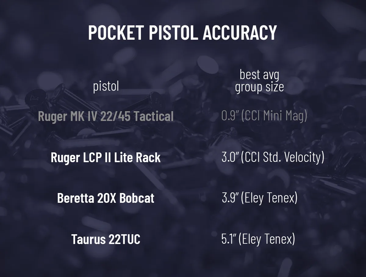 If we take each gun’s best-performing ammo based on average group size, the LCP was most accurate at 3 inches, the 20X Bobcat at 3.9, and the 22TUC at 5.1. For comparison, my Ruger Mk IV with a factory barrel and red dot easily shoots one inch or better. I’ve reviewed full size 9mm duty pistols that could barely do 4 or 5 inches with premium defense ammo. So all things considered, these groups are really not bad for these little guns.