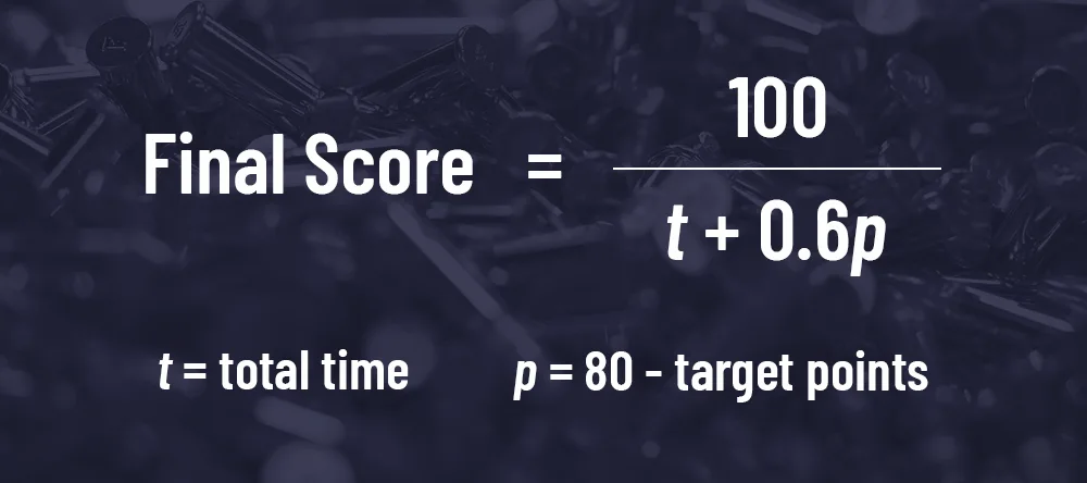 The Practical Test measures both speed and accuracy. At ten yards, I fire eight rounds at a B-8 bullseye as fast as I can while attempting to keep all my hits inside the black. I plug my time and points into this formula to get my final score, which heavily penalizes misses. I’m using the best of five attempts for our scoreboard.