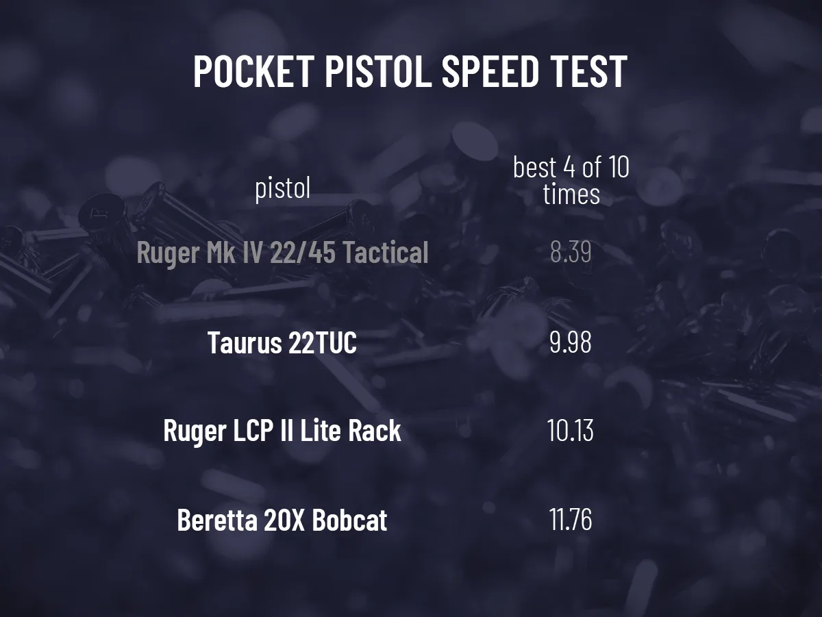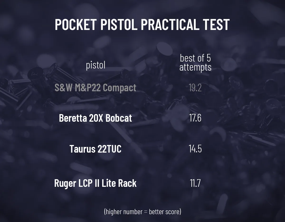 Out of the three pocket pistols, the Beretta 20X scored best at 17.6 thanks to its smooth DA/SA trigger and ergonomic grips. The Taurus’s DA trigger is a little tougher to control at that speed. The LCP’s sights hit a little to the right, so I had to do some Kentucky Windage, which slowed me down some.