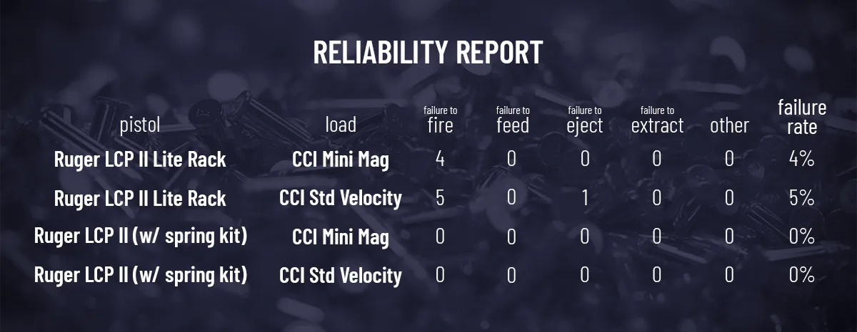 In my 2020 review of the LCP, I mentioned persistent issues with light primer strikes. That problem has only gotten worse. I was getting roughly 4 to 5% failures to fire, so I installed an aftermarket extra power hammer spring from Galloway Precision. That took care of the problem – 250 rounds with no issues.