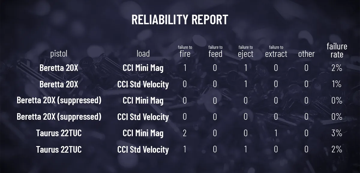 The Beretta 20X had a failure rate of 1-2% depending on the ammo. When I ran the test again with a suppressor attached, the failure rate dropped to zero. The Taurus 22TUC had a 2-4% failure rate.