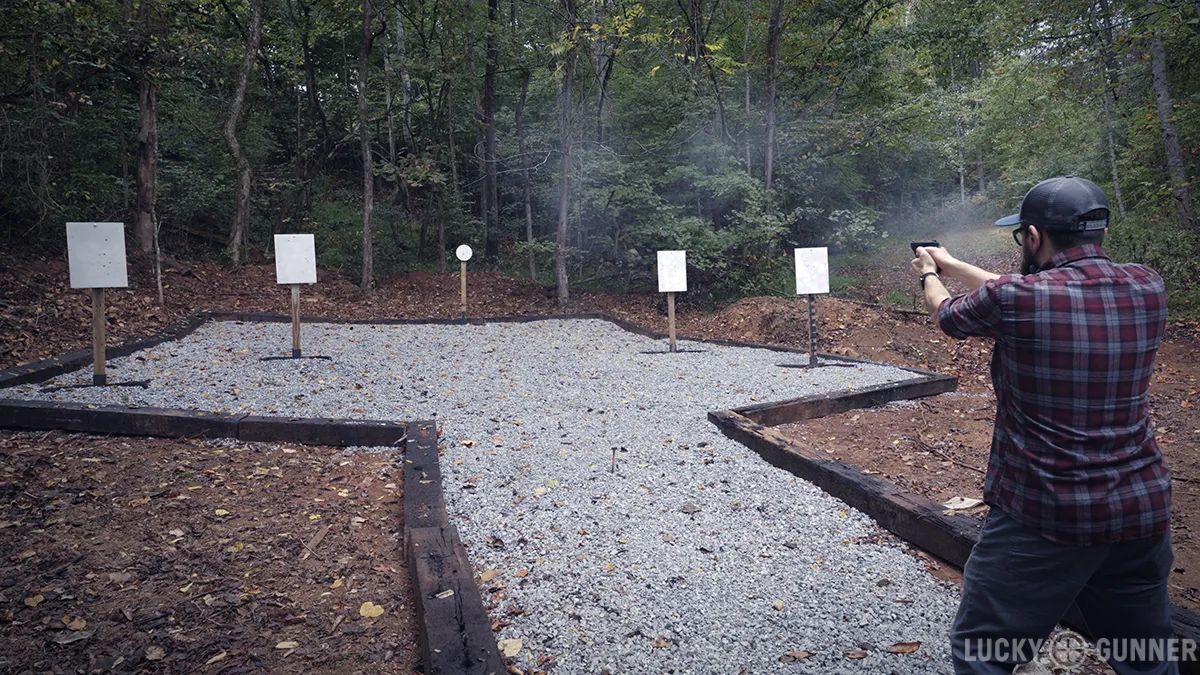 For our speed test, I’ve replicated a stage from Steel Challenge competition called “Smoke and Hope.” From low ready, you shoot four 18”x24” targets one time each, then hit the 12” stop plate. I’m scoring this a little differently than they do in a match. I’m adding up my best four times out of ten attempts.