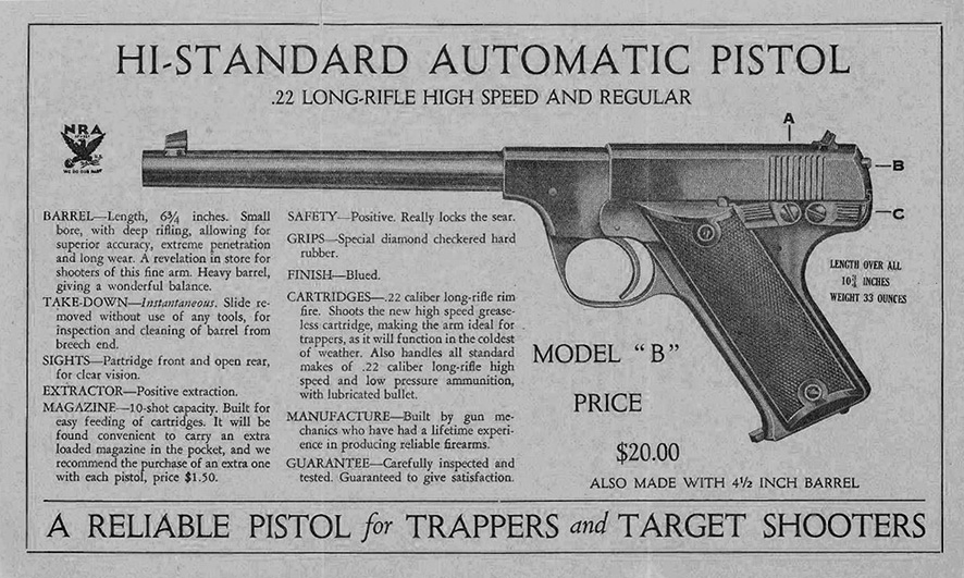 Fiala Arms went out of business and High Standard eventually acquired the design. They reworked it to make a blowback-operated semi-automatic .22 they dubbed the Model B, first sold in 1932.