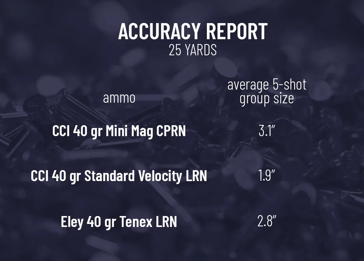 Let’s talk about accuracy. From a bench rest at 25 yards, I got an average 5-shot group size of 2.6 inches. It liked CCI Standard Velocity best with a 1.9-inch average.