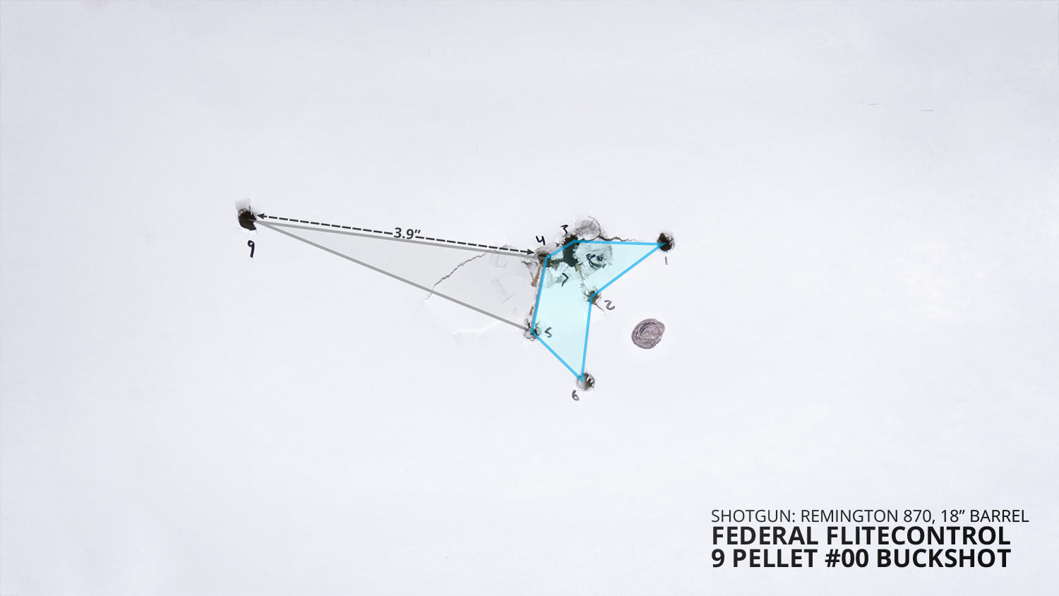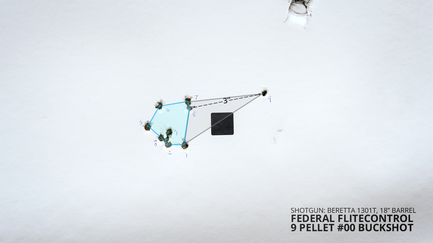 They aren’t all tight patterns, but there’s not a trend of single pellet flyers. Flyers do happen on occasion with 8-pellet loads, but in general, the 8-pellet shells are more predictable. Of course, as always, you have to pattern the load in your shotgun to see what it does. But if all else is equal, I would choose an 8-pellet load over a 9-pellet load. And it’s probably going to be FliteControl. At indoor distances, I’ll get a one hole group for maximum terminal effect. And it’s got moderate velocity so those pellets are more likely to stay in the bad guy.
