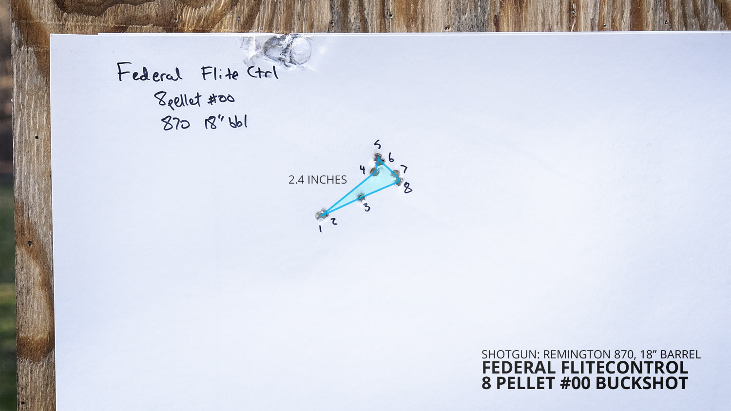 The result is that, with the majority of cylinder bore shotguns out there, you will get the tightest possible buckshot pattern with one of the Federal FliteControl loads. Here’s my 40 foot pattern with the 870 and the 8-pellet version of the #00 FliteControl. Just 2.5 inches.