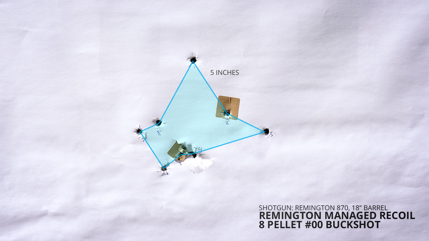 So if that’s the case, why not just use slugs? Forget the pattern and just make one big hole with one big chunk of lead. I think there’s some merit to that approach. Slugs are very effective and a lot more predictable in terms of what direction they go, but not necessarily in terms of how far they go. Most slugs are pretty good at penetrating hard barriers and if you let one of those go in your house and it doesn’t hit the target, there’s no telling where it’ll end up. Some of the segmenting slugs or other specialty slugs might help to mitigate that excessive hard barrier penetration. I’d want to see some pretty extensive testing on that before I’d be willing to rely on slugs in my house. Using buckshot doesn’t eliminate that problem, but it does mitigate it, especially with the lower velocity loads.