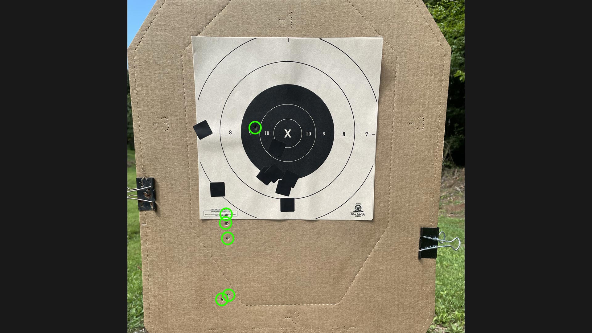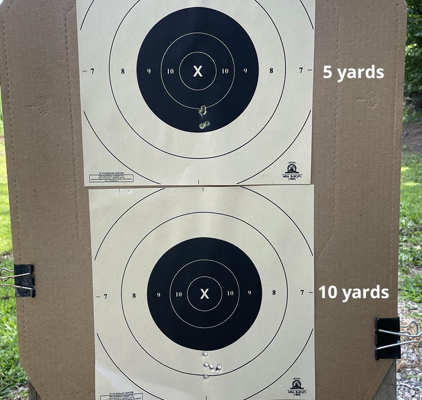 The next day, I went out to the range to see if I could figure out what was going on. Here’s a five-shot group at five yards.