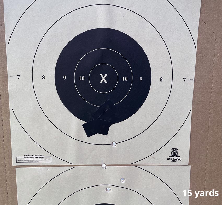 With a properly zeroed pistol optic, you will have some offset at close range, but that’s a little more than what’s ideal. That offset should have disappeared by the time I moved to about 15 yards, which is the distance I had last zeroed the gun. But here’s a five-shot group at 10 yards and it’s even lower than the five yard group. At 15 yards, my group was not only low, one of the rounds was off the target completely.