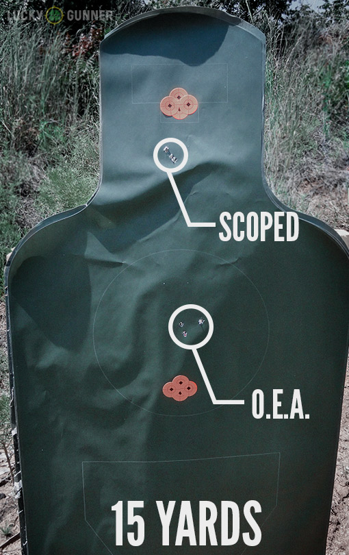 At 15 yards we’re starting to see the rounds wander off from our point of aim when the forward lens is occluded. Grouping is still reasonable in comparison to the test group however.