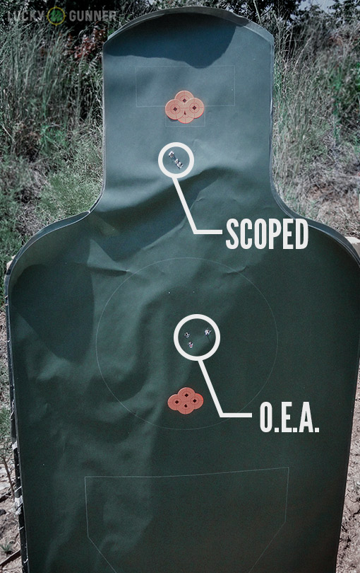Other shooters may experience different results. For example, it’s quite common for shots to deviate to the left instead of the right if the shooter focuses on the reticle instead of the target. The amount of vertical deviation is dependent upon the amount of head tilt necessary to obtain a cheek weld, and will vary between guns and shooters.