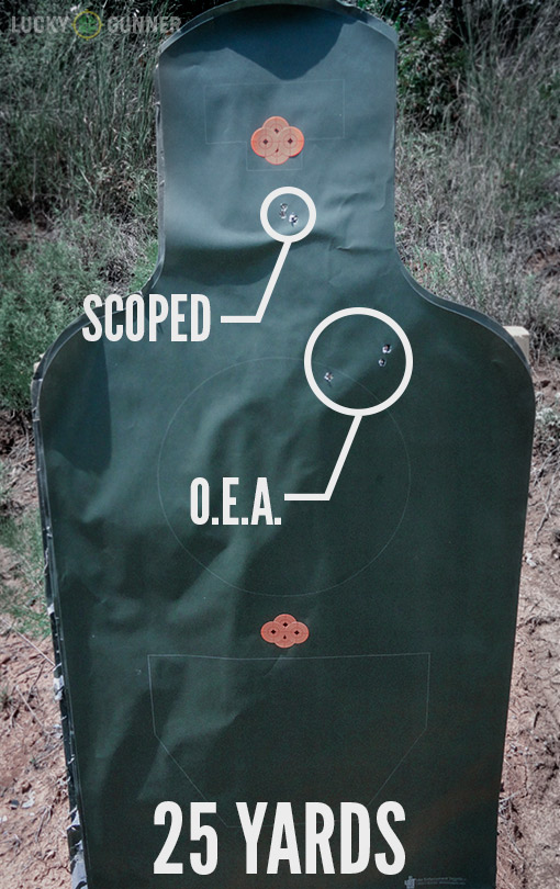 As you can see, the 5 yard line showed almost no difference between the positions of the shot groups relative to the point of aim. This is where occluded eye aiming really shines, and I actually shot a slightly tighter group without looking through the scope.