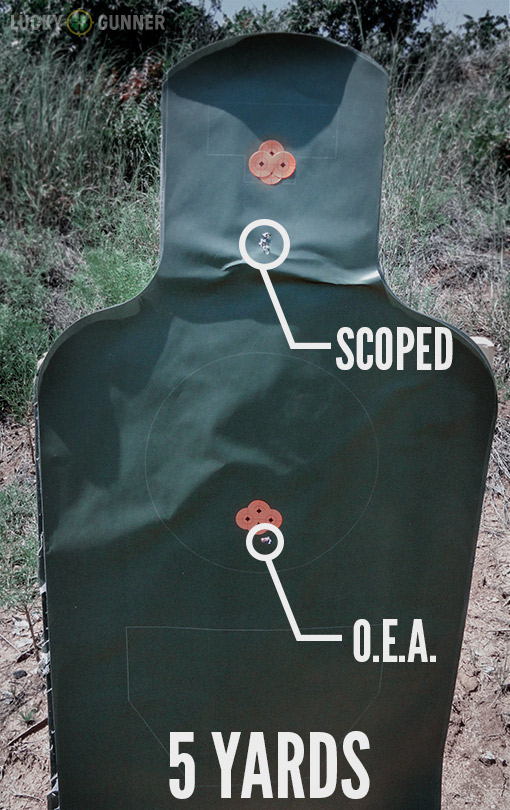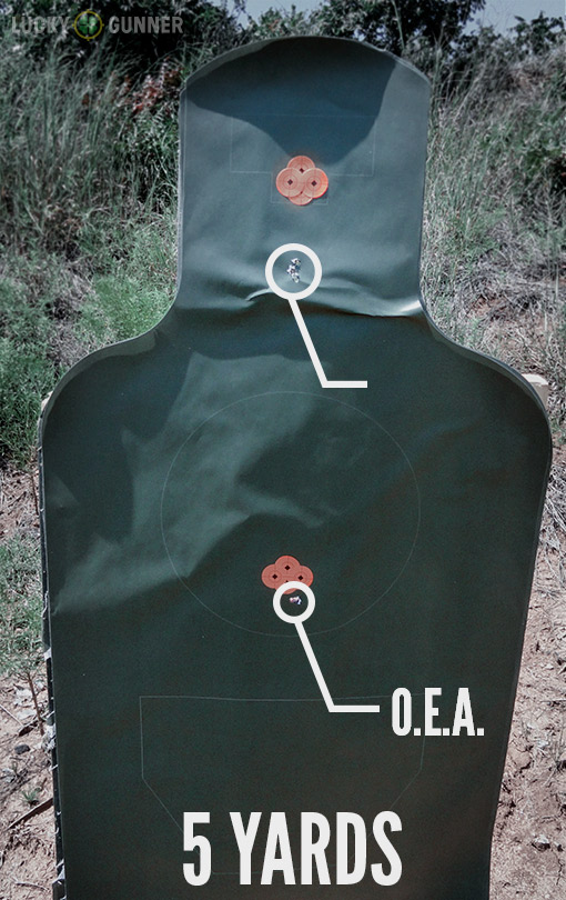 In order to show how dramatic the point of impact shift can be using occluded eye aiming I shot at distances of 5, 15, and 25 yards. Each target was shot first with a 3 round group in the head while looking through the scope normally. The objective lens cover was then immediately closed and another 3 shot group was fired using occluded eye aiming lower on the body while keeping my primary focus on the target.