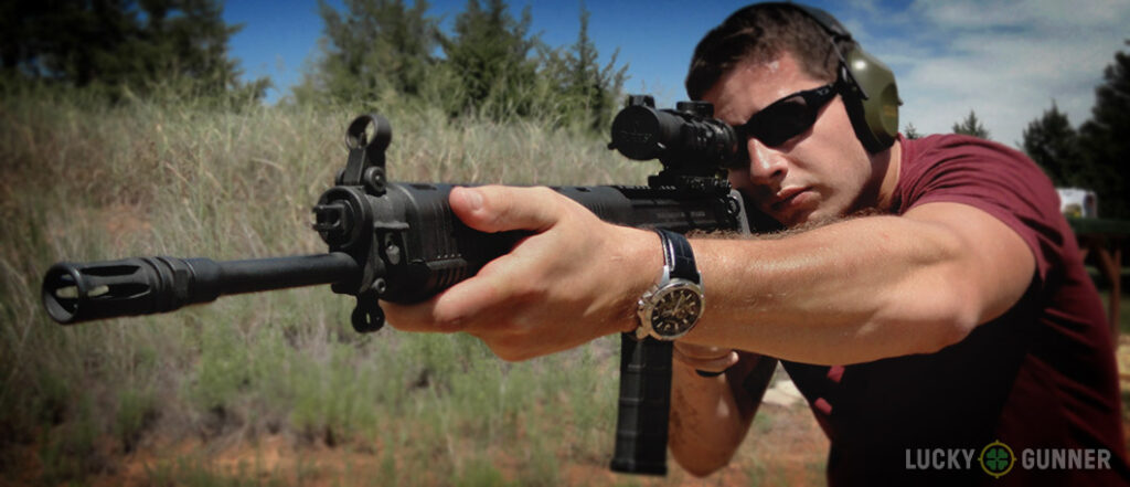 The ancient ancestors of modern red dot sights were actually purpose-built to use this aiming technique, but in order to use our scope as an occluded eye gun-sight all we’re going to need is an optic with an illuminated reticle and an objective lens cover. In this case, I am using a Burris AR-332 3x scope that ships from the factory with spring-open scope caps and an illuminated BDC reticle.