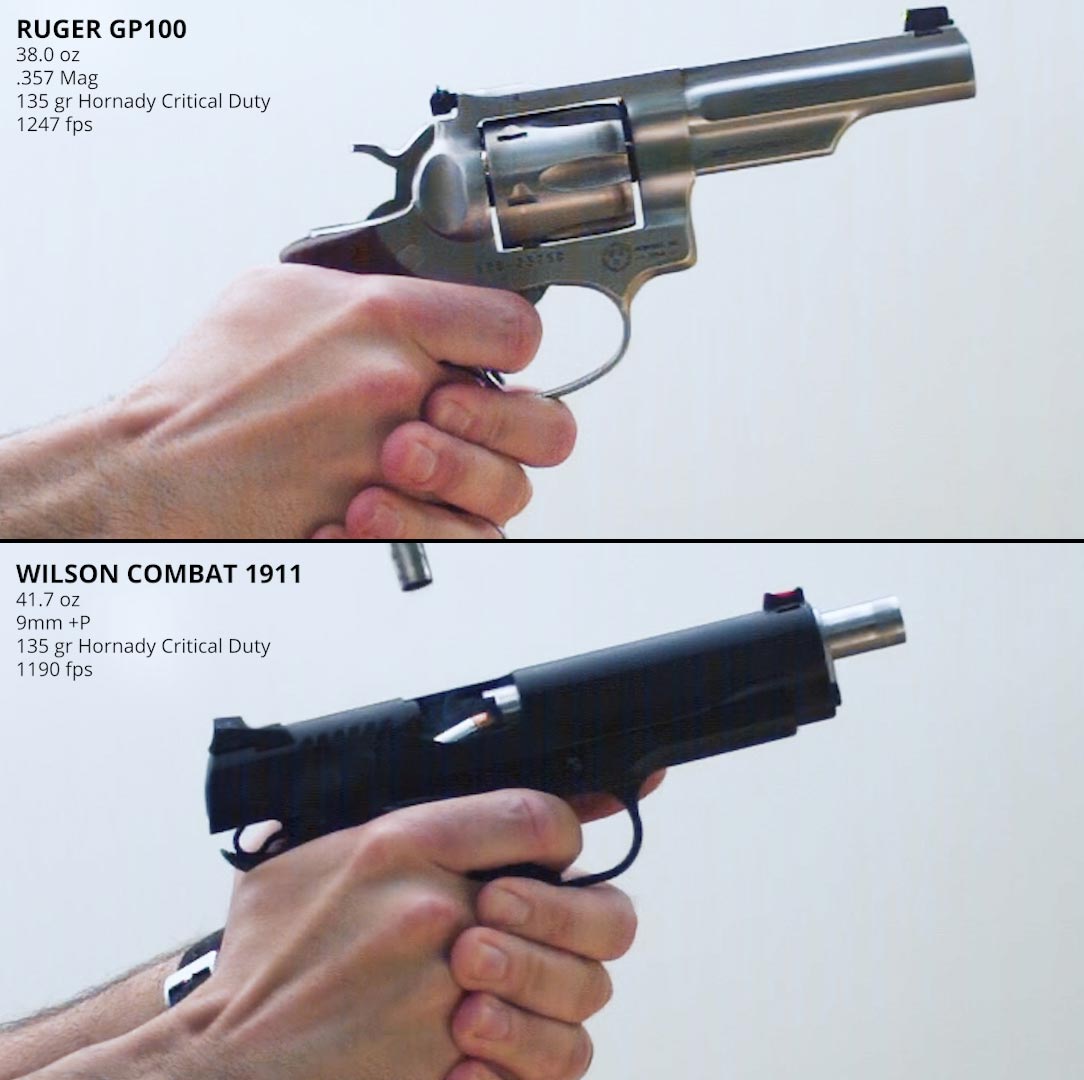 The most overt example is revolvers versus semi-autos. Here, we’ve got a Wilson 9mm 1911 and a Ruger GP100. They weigh about the same. They’re different calibers, but both are firing the same bullet weight at comparable velocities.