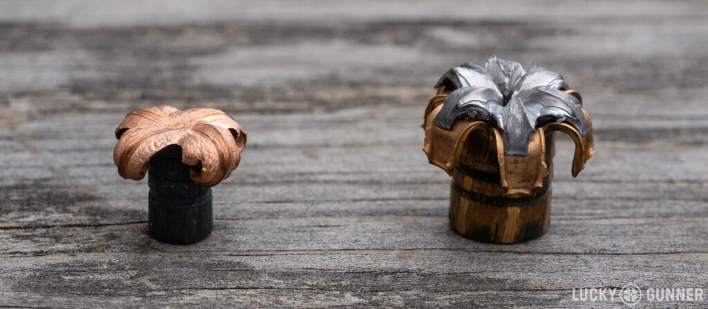 Let’s see how that looks in gelatin. This is a Barnes TSX all-copper expanding .223 Remington. It opens up shortly after impact which creates drag. That slows the bullet down, and the energy is transferred to the surrounding tissue. This one has also fragmented a little. The biggest chunk does exit the back of the gel block, but it’s not moving very fast. Most of its energy was used up in the block.