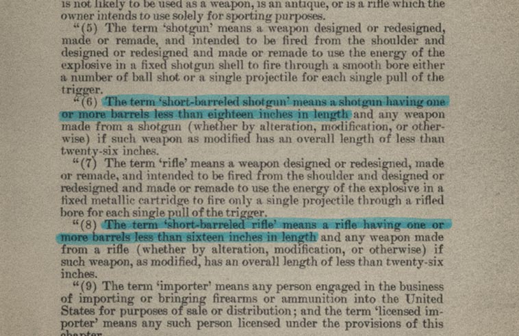Okay, back to the topic at hand. And let’s start with a little history lesson. We have to go back to 1934 with the passage of the National Firearms Act. It covers a lot of territory and it’s been amended a few times over the years. For now, the part we’re concerned with is minimum barrel lengths. According to the NFA, rifles must have a barrel length of at least 16 inches. For shotguns, it’s 18 inches. Anything shorter is considered a short barreled rifle or shotgun. You can own an SBR or SBS as they’re commonly known, but you first have to pay the ATF a $200 tax for each one. You also have to submit some paperwork with that $200. These days, it can take over a year for the ATF to process and approve your application.