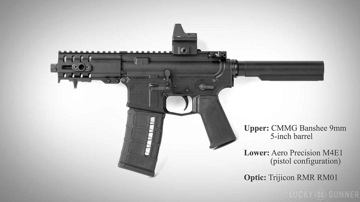 My demo gun today is a CMMG Banshee 9mm upper with a 5-inch barrel on an Aero Precision lower receiver in a pistol configuration. It feeds from P-mags with a 9mm conversion kit. I’ve got some other stuff planned for this gun if you guys want to hear more about it in the future.