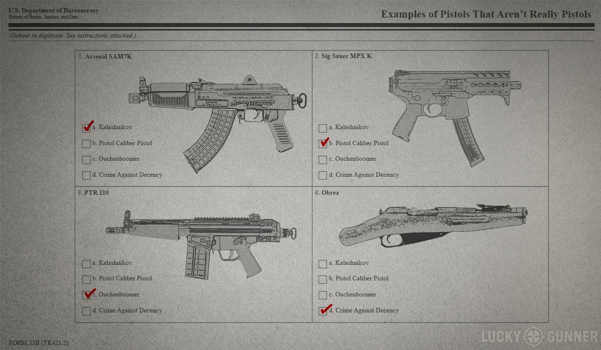 So that is how we ended up with pistols that look just like short barreled rifles but they’re regulated completely differently.