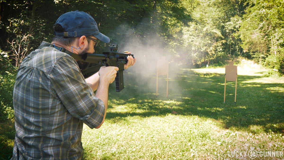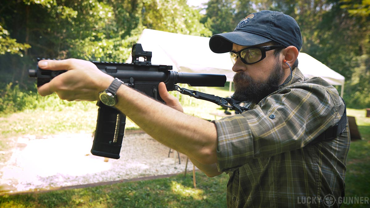 Basically, it’s a combination of stabilizing the gun with tension from a two-point sling and getting a firm cheek weld on the buffer tube. Rhett can run his 10.5-inch 5.56 AR pistol that way almost as well as he can with a shoulder stock. I’ve tried it with this gun and it hasn’t been quite that effective for me. But this little 5-inch gun has more upward muzzle movement and there’s a lot less space on the forend to get a good grip. An 8-inch or longer barrel would probably be a little easier to control. Still, it’s the most viable technique I’ve seen for running an AR pistol without a brace or a stock on it.