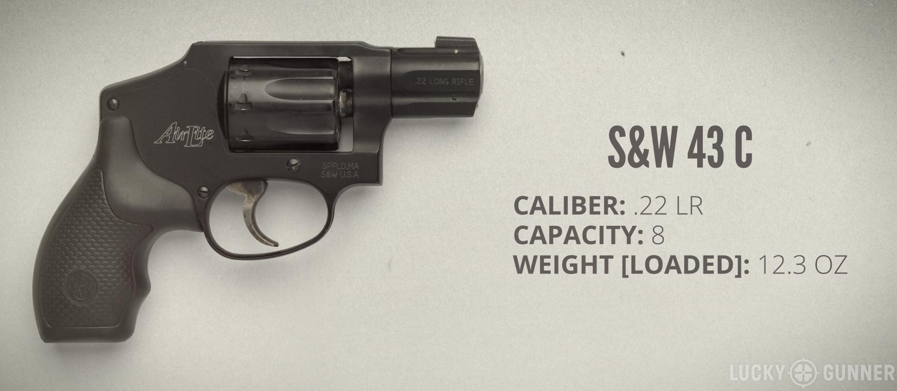 Four is the Smith & Wesson Model 43 C. This is the 8-shot J-frame .22 LR that I’ve used previously in our pocket pistol series. It’s not especially small next to the NAA Mini-Revolver, but it is very light at 12.3 ounces loaded. I’m drawing it from a Can Can Concealment Micro Sport Belt. This is essentially an elastic belt with several sleeves sewn into it for carrying a small handgun in whatever position along the waistline you prefer.