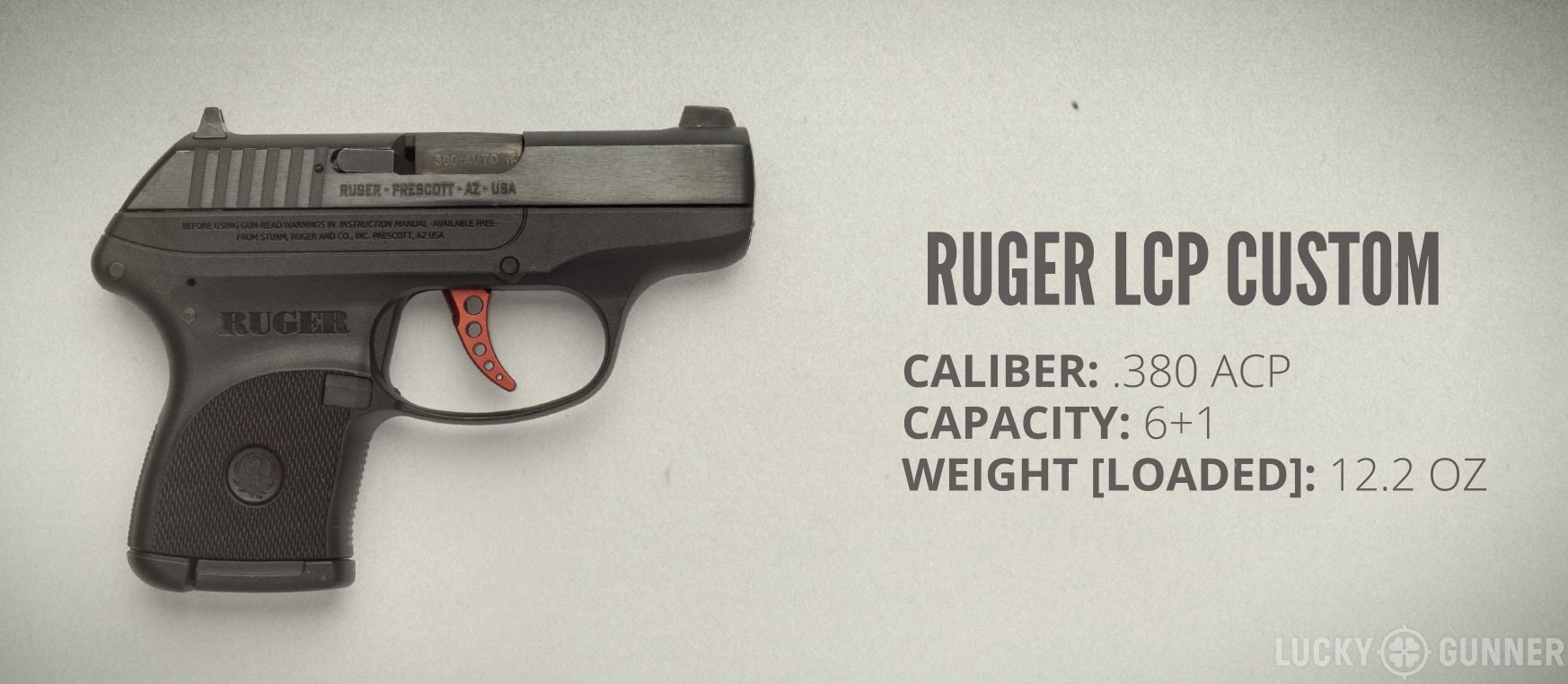 First is the ubiquitous Ruger LCP. It weighs 12.2 ounces loaded with seven rounds of .380 ACP. This one is a factory variant they call the LCP Custom with improved sights and a red aluminum trigger. I’m drawing it from a Blue Force Gear pocket holster in my right front pants pocket.