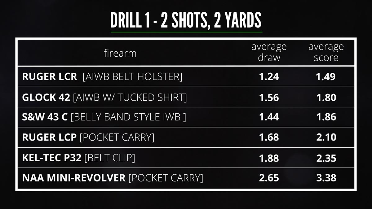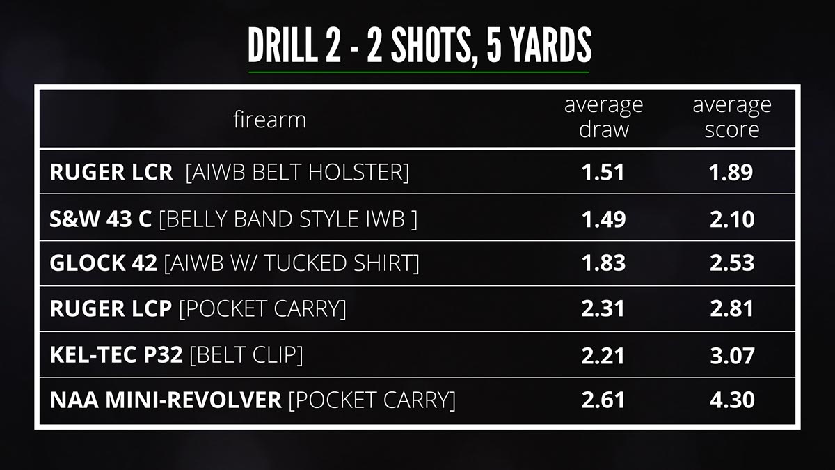 Again, the LCR with the Phlster belt holster was the fastest with an average time of 1.89 seconds and a 1.51 draw. Drawing the LCP from a pocket was almost a full second slower with a 2.81 average time. The Kel-Tec pocket clip was even slower than that, but the Mini-Revolver… average time of 4.3 seconds. Again, the poor ergonomics led to a lot of mistakes in the drawstroke, but at this range, accuracy also suffered. With such a short barrel, even the tiniest misalignment will send the rounds way off target. Averaging my best six out of twelve runs, I still ended up with a very slow time of 3.68 seconds.