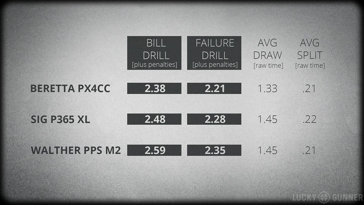 The times are all pretty close. Most of the difference between the PX4 and the smaller guns actually came from the draw speed. It’s always easier to grab a larger gun out of the holster. I missed the A-zone a couple of times with the PPS and I added a quarter second to my times for every miss. Otherwise, it was right on par with the Sig in terms of raw speed.