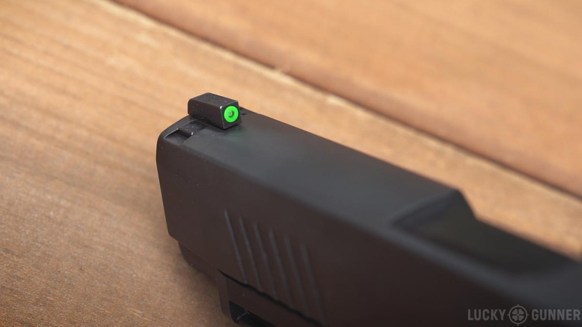 The SIG X-RAY3 sights that come with the gun are also very nice and I almost never say that. For low light, they’ve got a three-dot tritium setup, but in normal light, the rear sight is basically black and the front sight has a highly visible neon green ring. If you don’t like that, of course you can just go with a red dot. There are two screws in the bottom of the slide. If you remove those, this plate and the rear sight come off so you can mount a micro red dot optic.