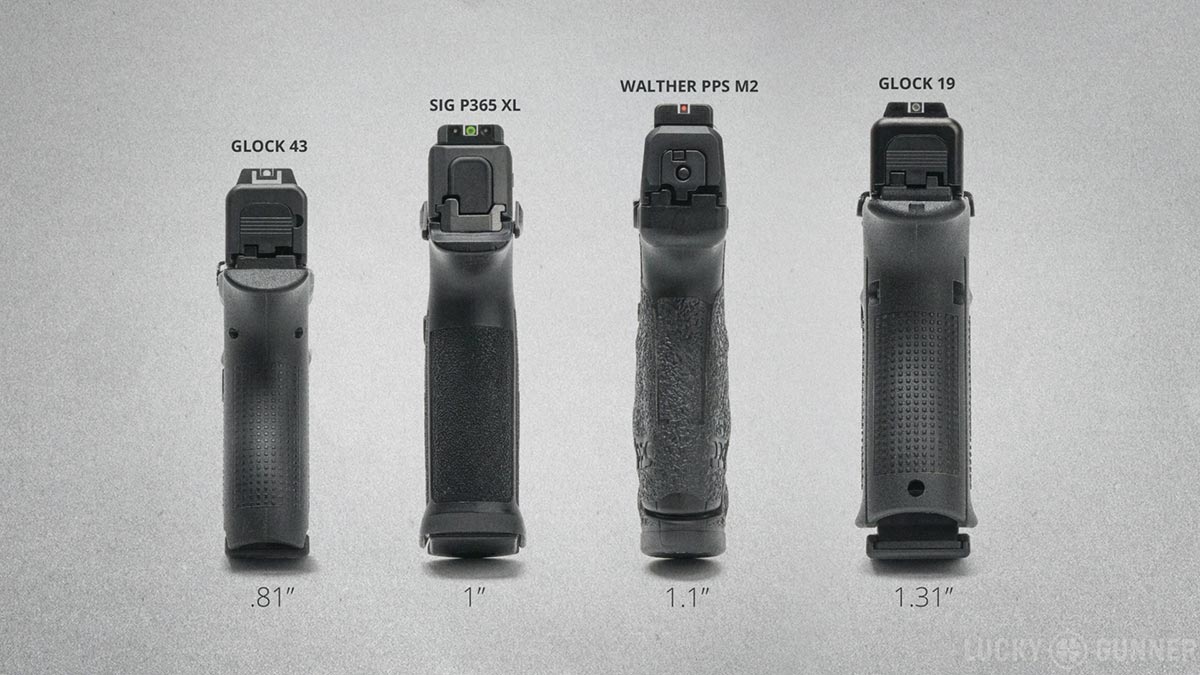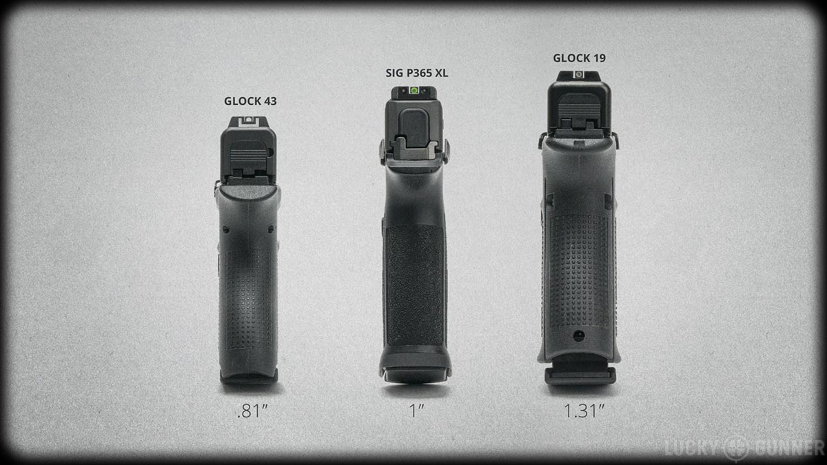 Now let’s throw the P365 XL in there. Just as you might expect, it’s right in between the two. Maybe a little closer to the 43 with a grip that’s just 1 inch thick. But let’s go back to the side view.
