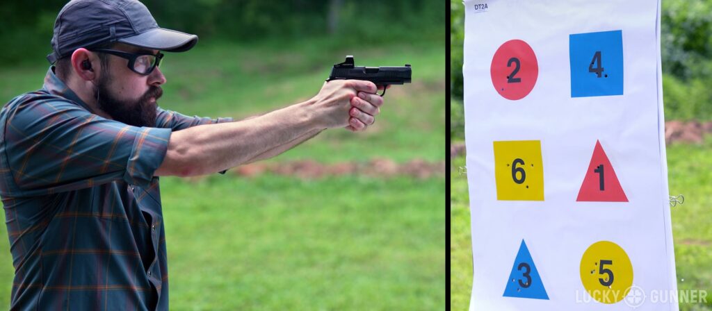 We picked a perfect day to go to the range — 92 degrees and super humid. So within a few minutes, everything was drenched in sweat. That adds an extra challenge, especially for a smaller gun like the Sig P365 XL I was using. Recoil control and gun manipulations are always more difficult with sweaty, slippery hands. So I maintained a careful pace throughout the drill and ended up with a clean run of 19.11, just inside the par time by a couple of seconds.