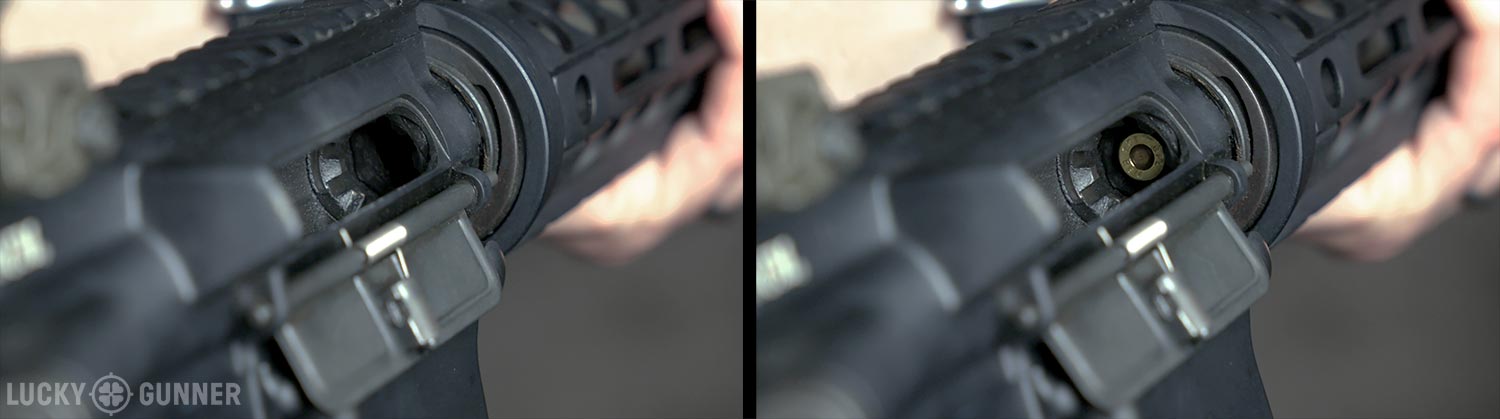 With the bolt locked open, get a good look inside the chamber (which is just the technical name for the part of the barrel where the ammo goes). We want to see an empty chamber like this [left in the photo below], but if there’s a round still in there for some reason, it’ll look like this [right photo]. That round should have ejected when you opened the bolt. If it didn’t, your gun might be broken and you need to involve someone who knows what they’re doing.