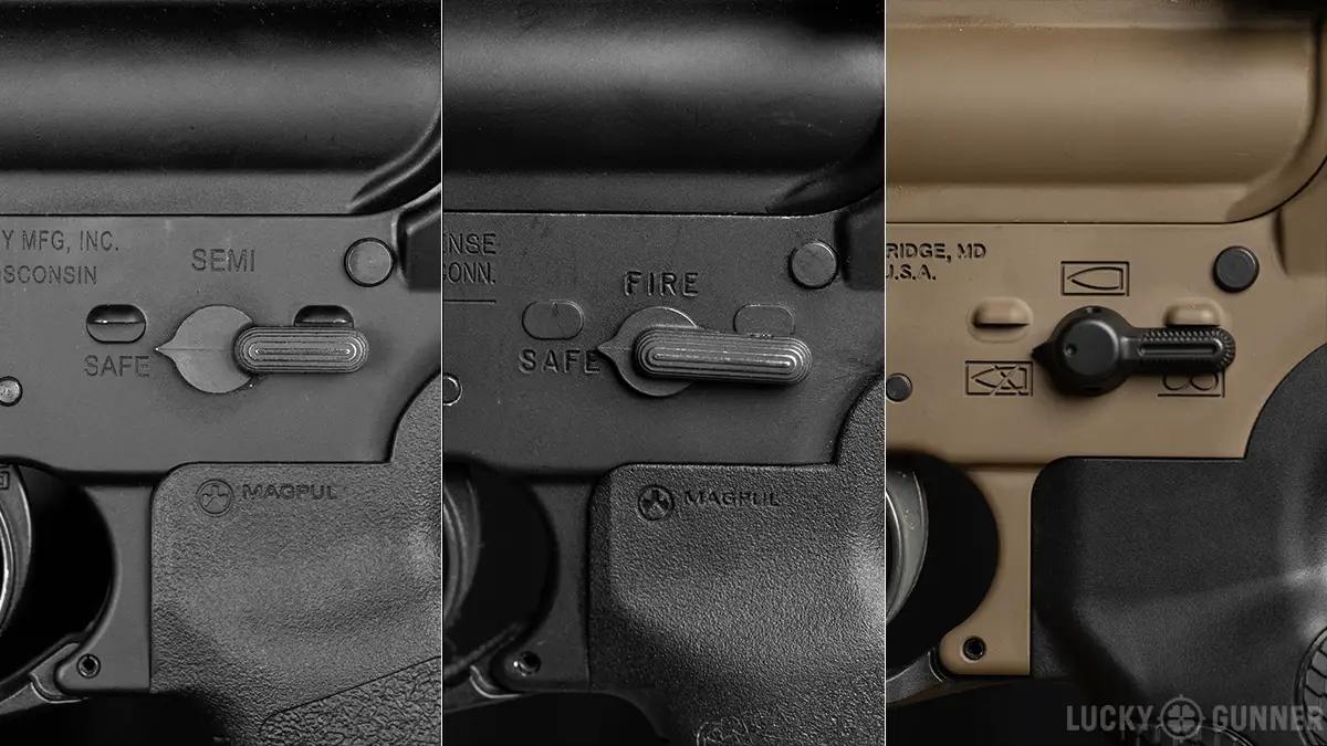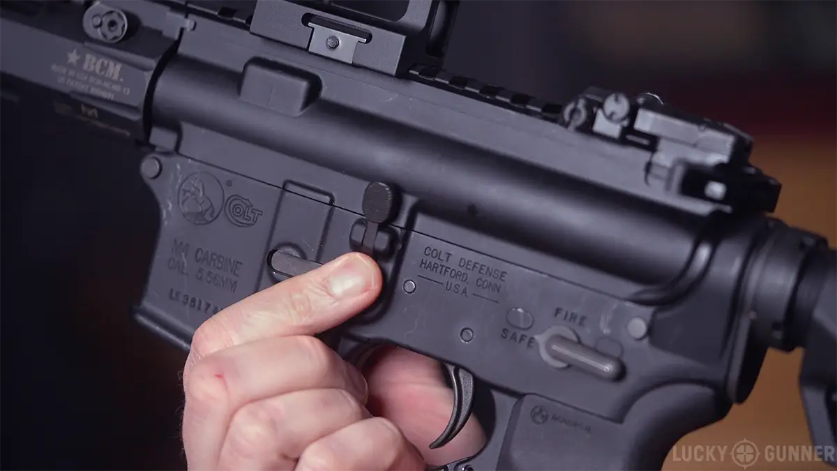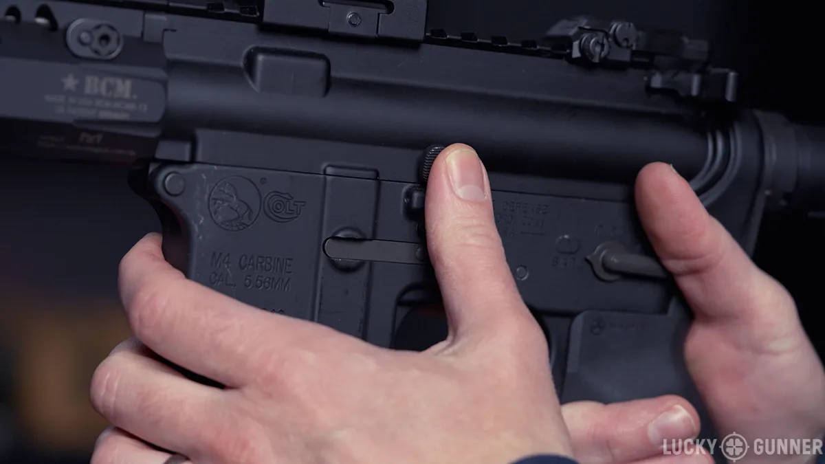 On the left side of the gun above the grip you will find the safety selector. Again, sometimes it’s on both sides of the gun, but usually just on the left. On most ARs, there will be two options: safe and fire, or something similar. Move the safety selector so the pointy bit is on “safe,” if it’s not already.