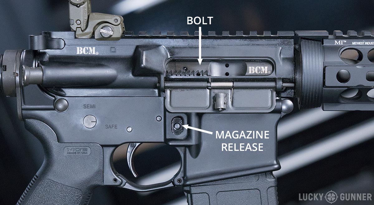 The first step is to remove the magazine. The magazine release is here on the right side of the rifle. Some rifles have an additional button on the left side, but most don’t. Just push that in and the magazine will drop free.