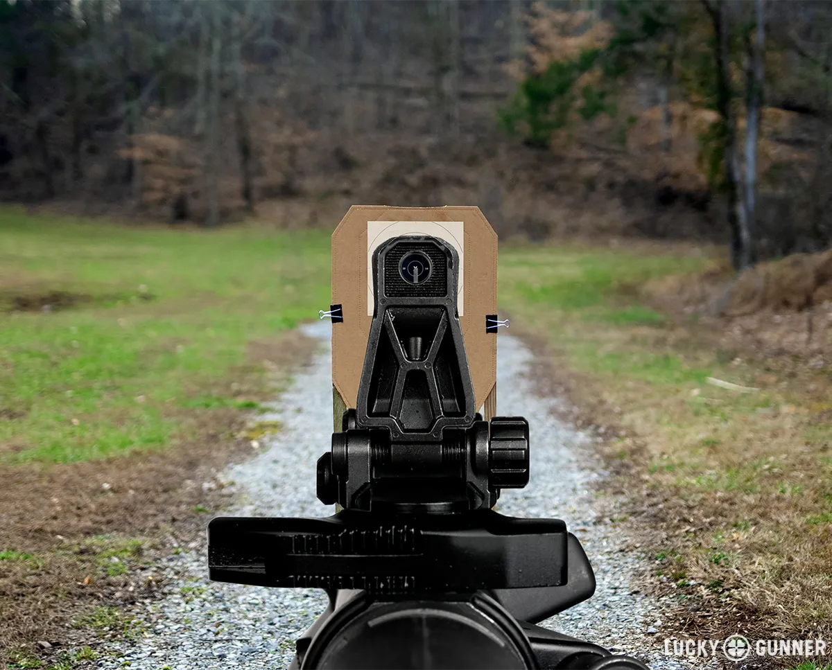 If you don’t have an optic, then hopefully your rifle is equipped with a set of iron sights. Iron sights aren’t actually made of iron, that’s just the term for any kind of traditional sighting system where you have a front and a rear sight you have to line up. Iron sights on ARs are usually the aperture style, also called peep sights. The rear sight is a hole you look through and the front sight is a post. Iron sights on ARs originally looked like this, but today they’re usually the flip up style. If that’s what you have, make sure your sights are flipped up before you try to use them.
