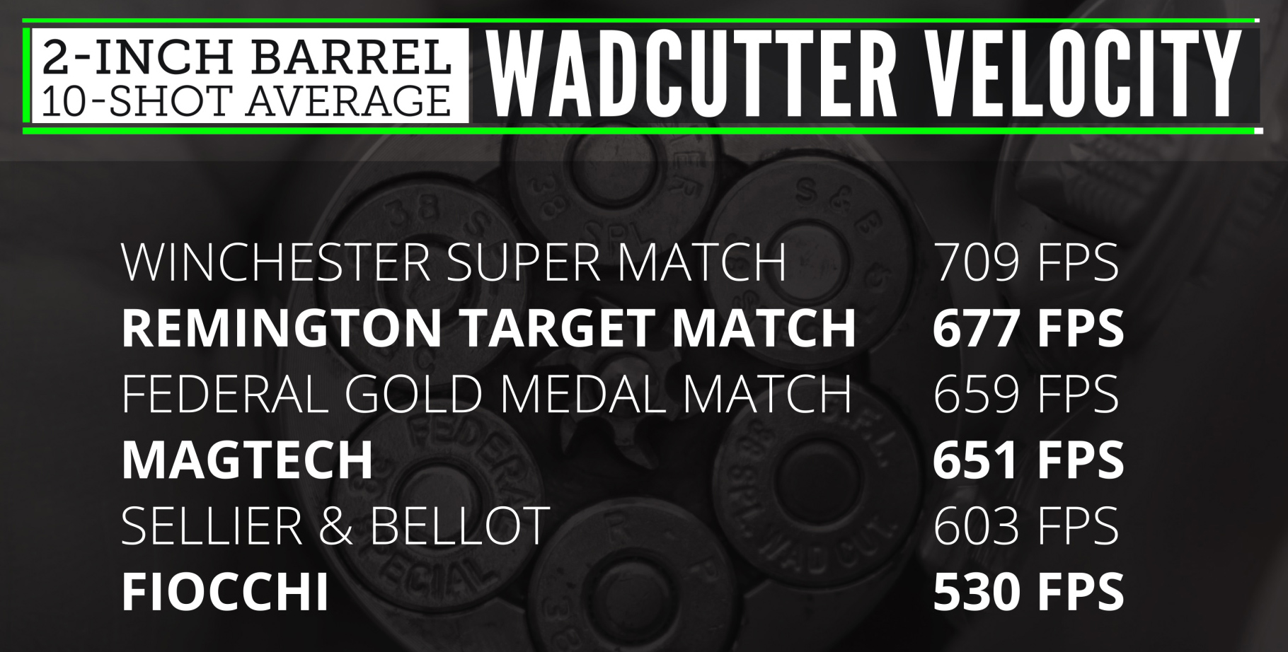 Most major ammo manufacturers produce some kind of 148 grain .38 special wadcutter load but they can have pretty drastically different velocities from one brand to the next. I did some chronograph testing with wadcutters from six different ammo makers and took the average velocity of 10 shots fired from a 2-inch barreled revolver.