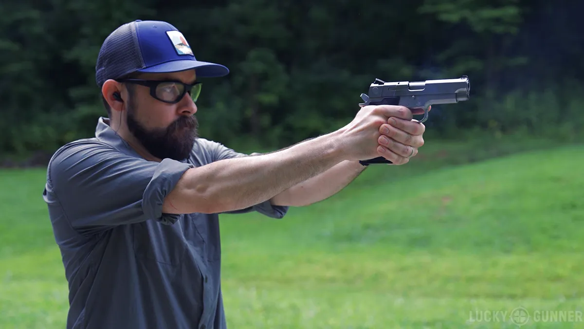 It is heavy. Loaded, it weighs 46 ounces, which is a bit more than a 1911. The balance is odd. It feels kind of awkward and front-heavy at first. But you get used to that. It’s not something I notice when I’m actually shooting it.