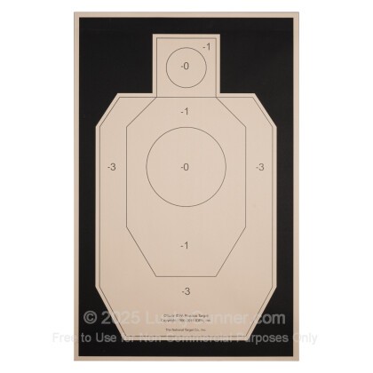 Each target features a -0 zone at the center-of-mass and head, a -1 zone at the inner torso, and a -3 zone at the outer torso. The silhouette is complemented by a standard, non-scoring outline which borders a black background. These targets measure 22.5 inches wide by 34.5 inches tall; they are compatible with modern indoor range hangers and can be used as refreshing overlays for cardboard targets.
